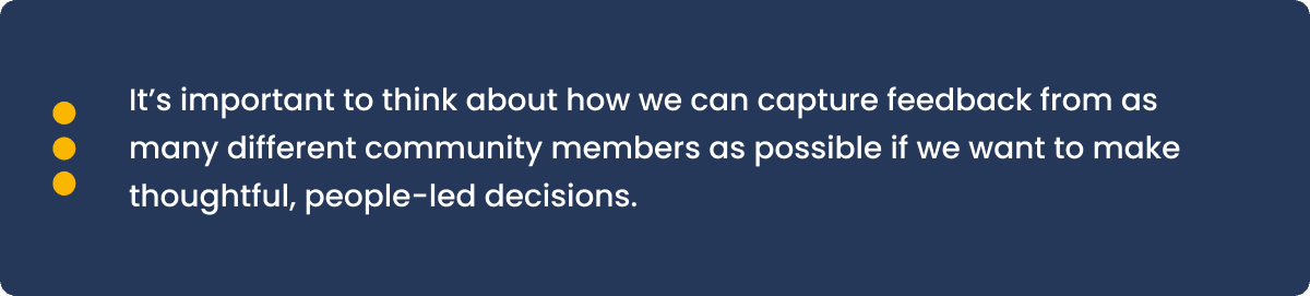 The community setting has even more diversity than the typical workplace. So, it’s important to think about how we can capture feedback from as many different community members as possible if we want to make thoughtful, people-led decisions.