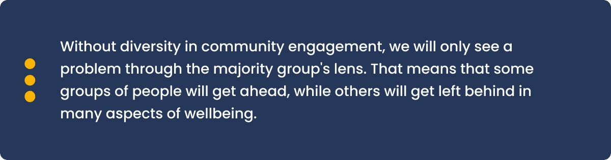 Without diversity in community engagement, we will only see a problem through the majority group’s lens. That means that some groups of people will get ahead, while others will get left behind in many aspects of wellbeing.